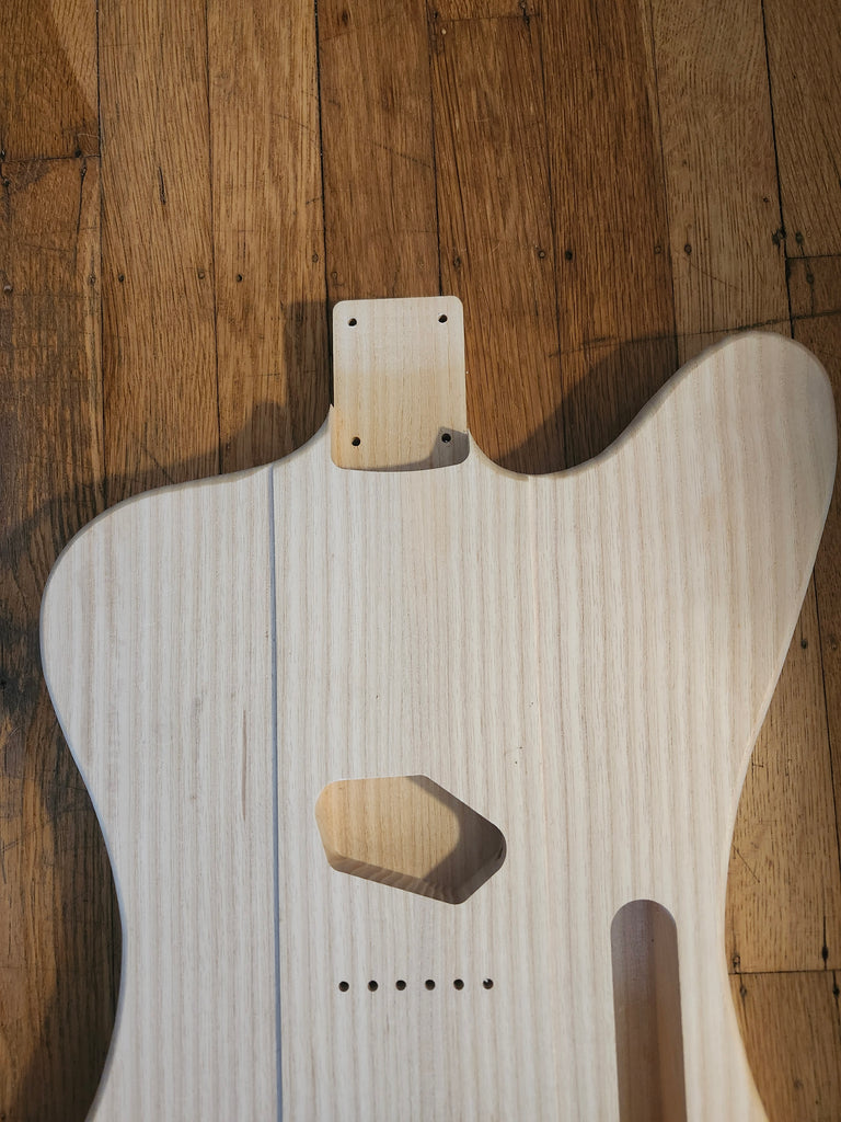 This is a professional cut F style 2pc poplar body. Single coil bridge set up with pre-drilled wiring holes. Very solid body at 1 3/4" thickness weighing in at 5lbs this is the real deal. Ready for your new build out of the box!